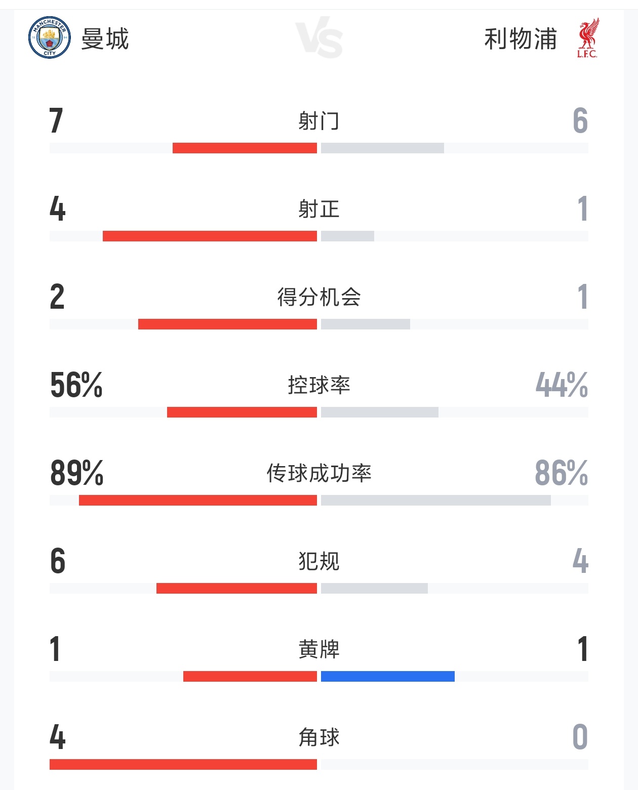 曼城2-0利物浦半场数据:蓝月亮7射4正 红军仅1射正