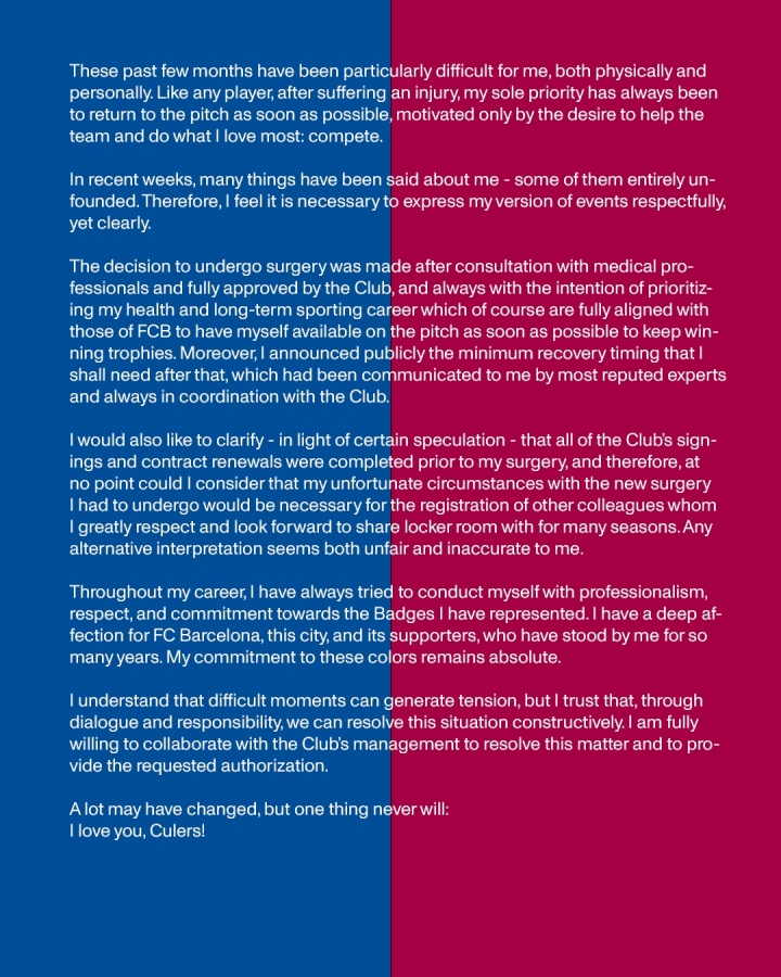 特尔施特根近日被巴萨暂时劫夺队长袖标,球员发表声明,对近期的事情作念出回复。
