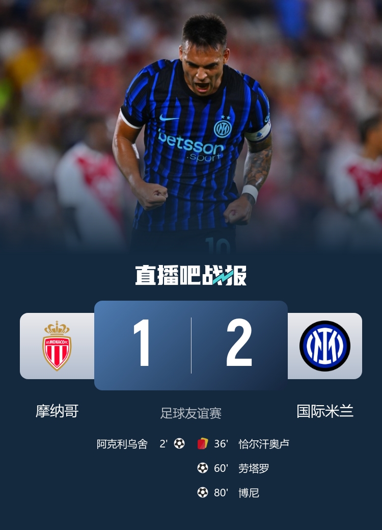 友谊赛对阵,十东说念主国米2-1逆转摩纳哥,恰20在第36分钟就染红,劳塔罗、博尼破门助球队取胜。