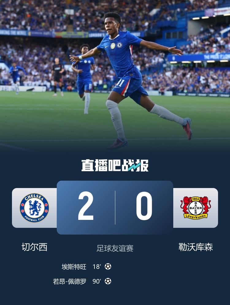友谊赛对阵,切尔西2-0打败勒沃库森,埃斯特旺首秀破门,若昂-佩德罗也不息了进球状况。