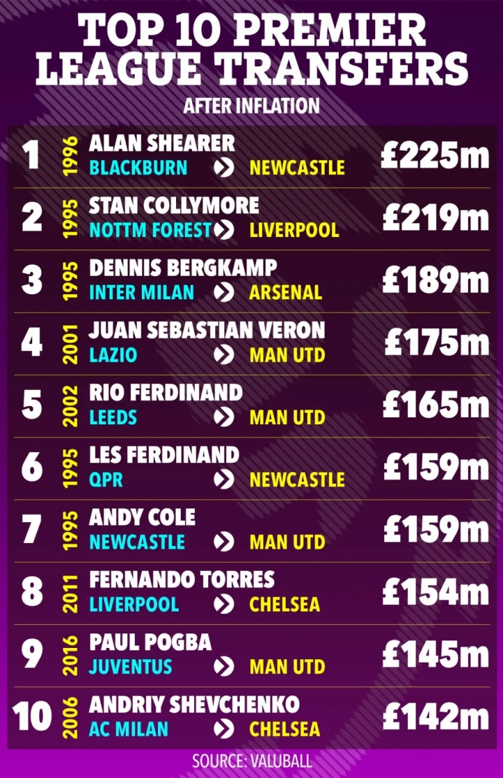 1、阿兰-希勒,1996年,布莱克本→纽卡,2.25亿镑