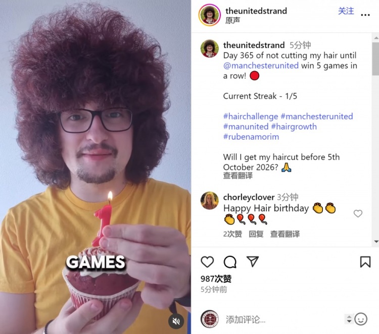 蓄发哥社媒晒出系念蓄发一周年视频,配文:“不剪头发直到曼联5连胜,第365天,面前连胜情状——1/5。”