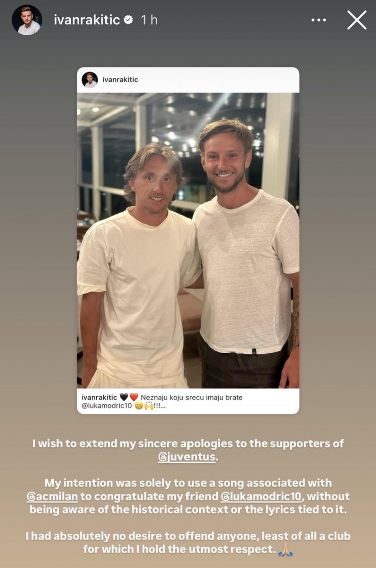 8月5日讯 拉基蒂奇更新社媒动态,为误用侮辱尤文的歌曲致歉。