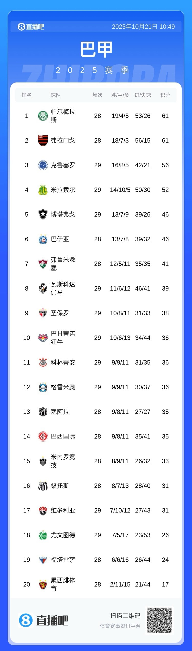 当今在积分榜上,桑托斯少赛一场28战31分位列第16位,维多利亚凭借这场成功积分也来到31分排在第17位,凭据巴甲礼貌,联赛临了四位径直左迁。