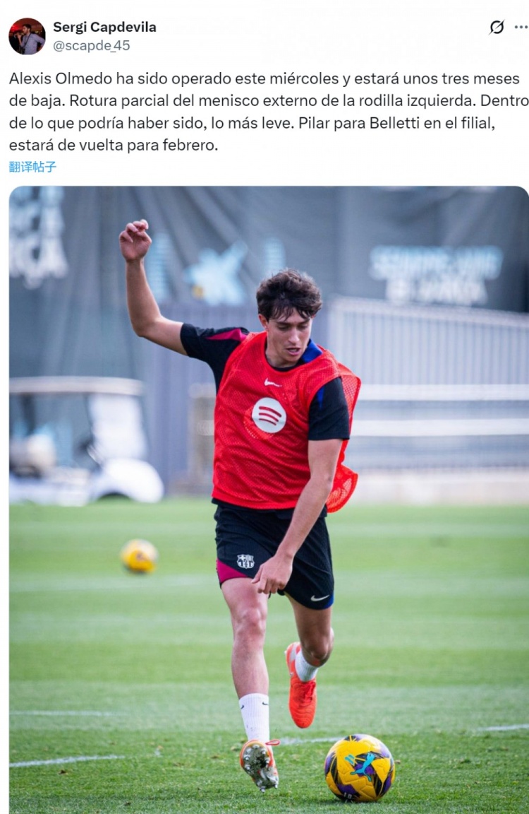 Sergi Capdevila长远,巴萨竞技(巴萨B队)小将奥尔梅多左膝外侧半月板部分扯破,在预期的伤情中,这是最隐微的。奥尔梅多当天了秉承手术,瞻望将伤缺三个月,来岁2月转头。
