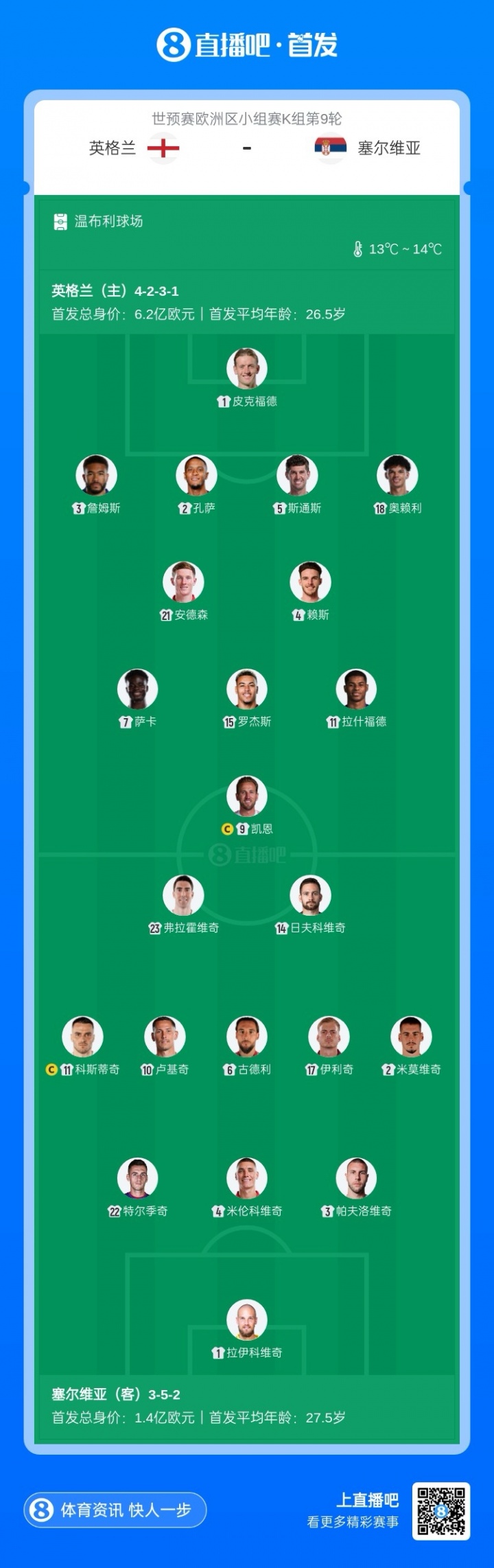 11月14日讯 世初赛欧洲区小组赛K组第9轮,英格兰主场迎战塞尔维亚,赛前两边首发公布。