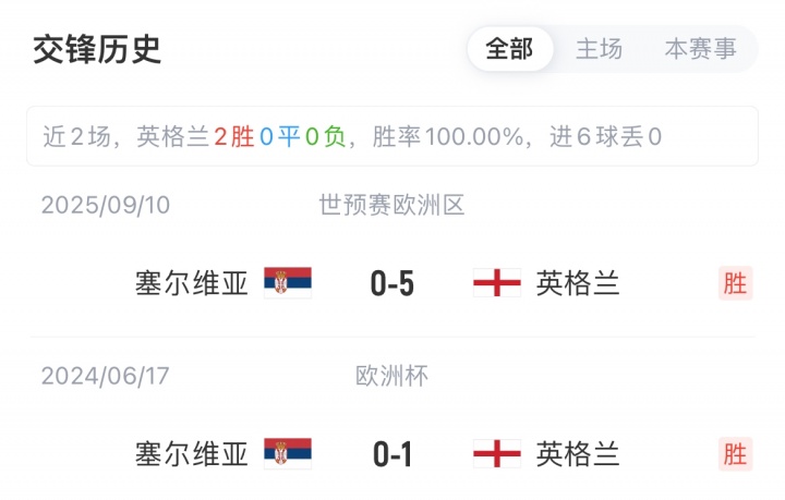 英格兰世初赛6轮全胜积18分,已提前两轮晋级宇宙杯;塞尔维亚世初赛3胜1平2负积10分位居K组第三,近3轮仅1胜,现在过时第二的阿尔巴尼亚1分,将与其在终末两轮争夺附加赛限额。英格兰对阵塞尔维亚已获两连胜。