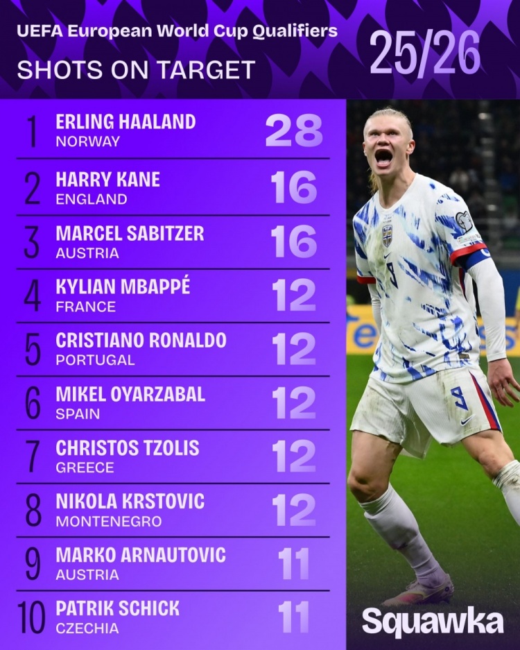 11月20日讯 本届世欧预小组赛照旧告一段落,squakwa也统计了本届赛事射正情况,哈兰德断崖领跑。