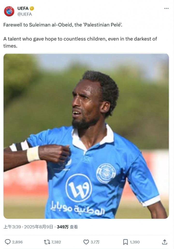 08月09日讯 欧足联官方发布帖文,向死于以色列遑急的巴勒斯坦前国脚奥贝德默哀。