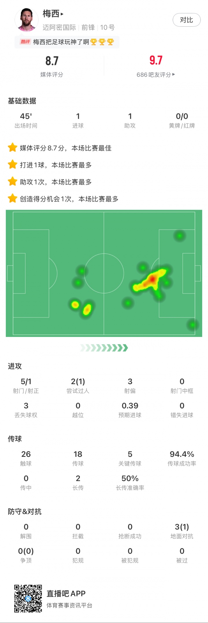 宣告追思!梅西数据:出战半场1球1助 5次枢纽传球 8.7分全场最高