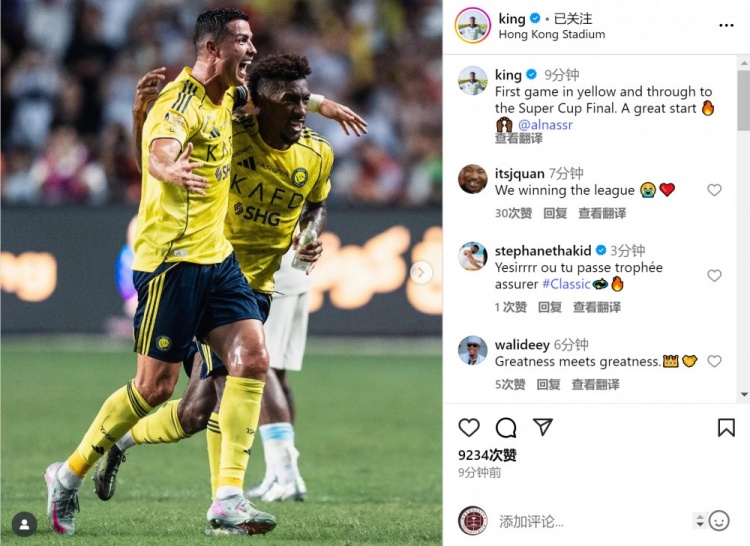 科曼社媒晒出与C罗一谈庆祝的像片,配文:“身披黄色战袍的首场比赛,晋级沙超杯决赛,很棒的驱动!”
