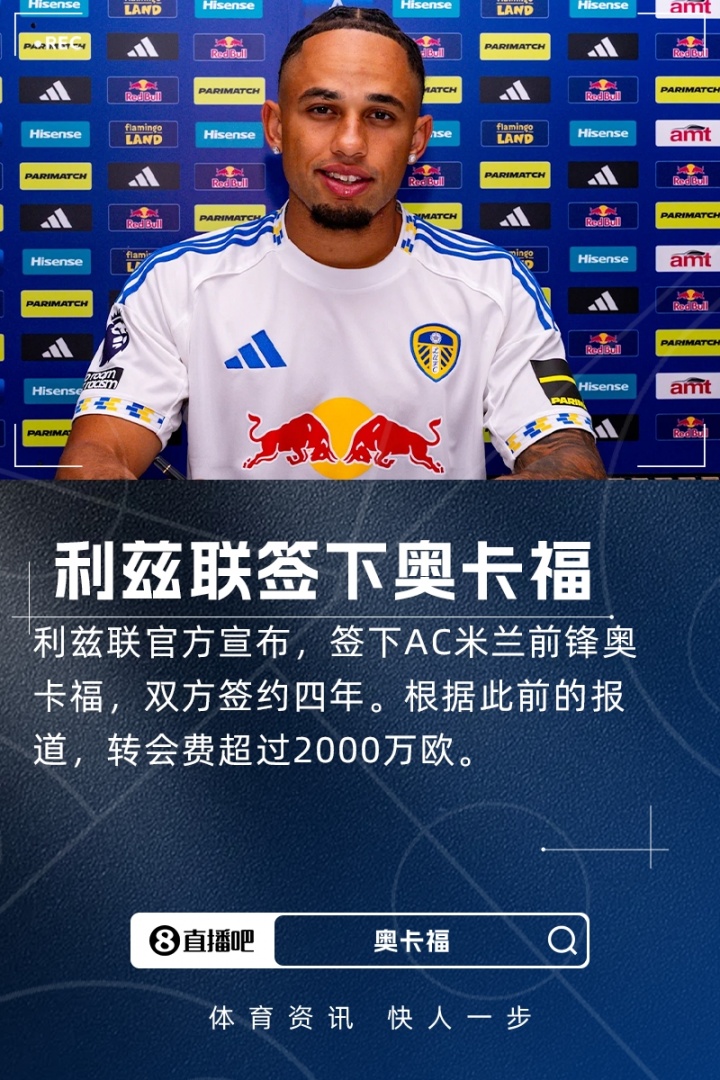 08月21日讯 官方讯息,利兹联签下米兰前卫奥卡福,两边签约四年,据此前罗马诺报说念,转会费超2000万欧。奥卡福这亦然利兹联今夏第九名新援。