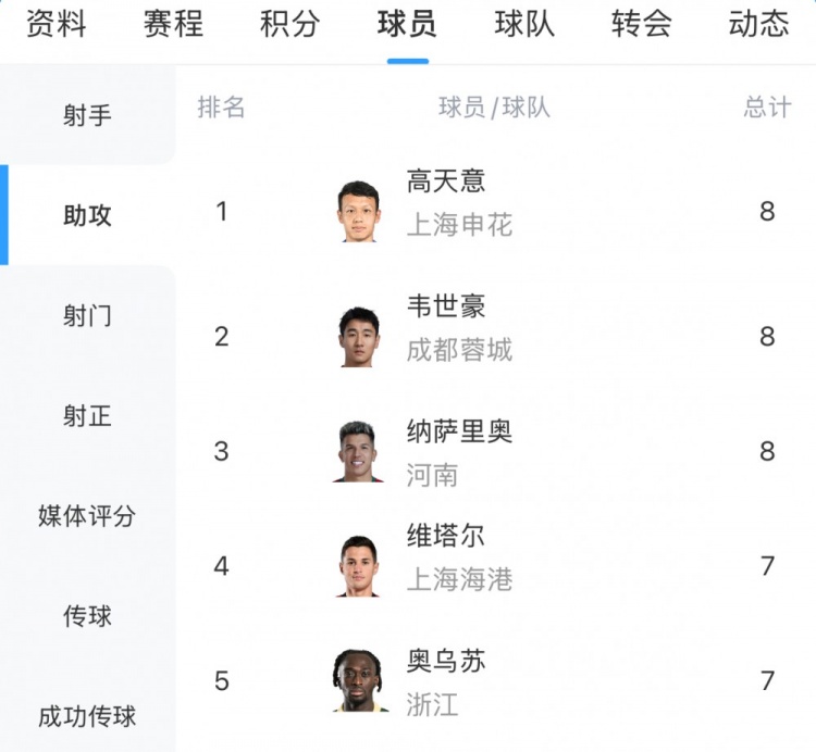 中超助攻榜:韦世豪、纳萨里奥追平高天意,8次并排榜首
