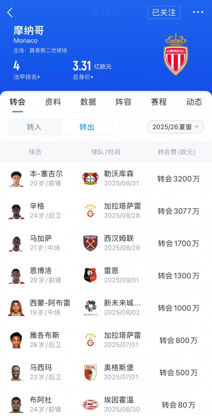 在转出方面,摩纳哥卖了本- 塞吉尔、恩博洛、辛格等东说念主,转会费收入1.16亿欧。