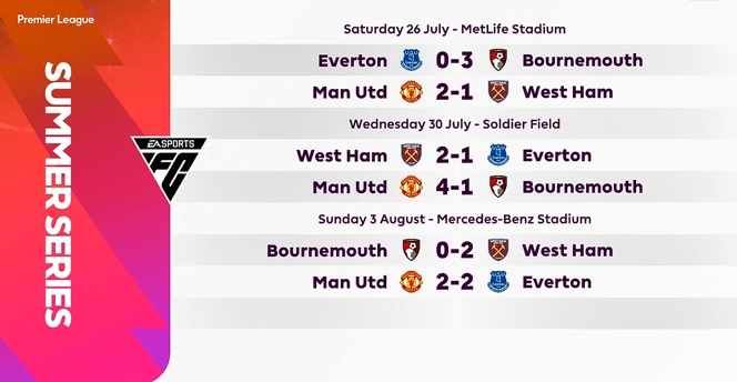 本届英超夏日赛参赛队为曼联、埃弗顿、西汉姆和伯恩茅斯,曼联先后2-1西汉姆、4-1伯恩茅斯、2-2埃弗顿,以2胜1平战绩夺冠。