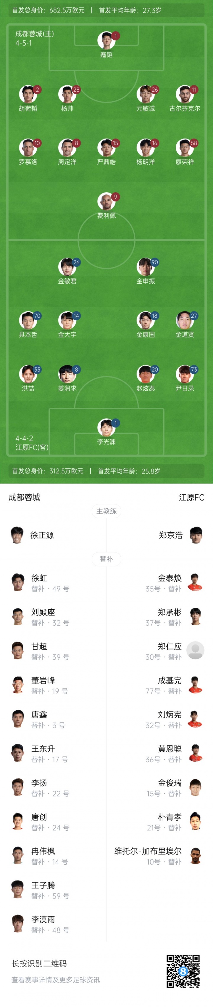 蓉城vs江原首发:蓉城尽遣主力!罗慕洛、费利佩先发,周定洋登场
