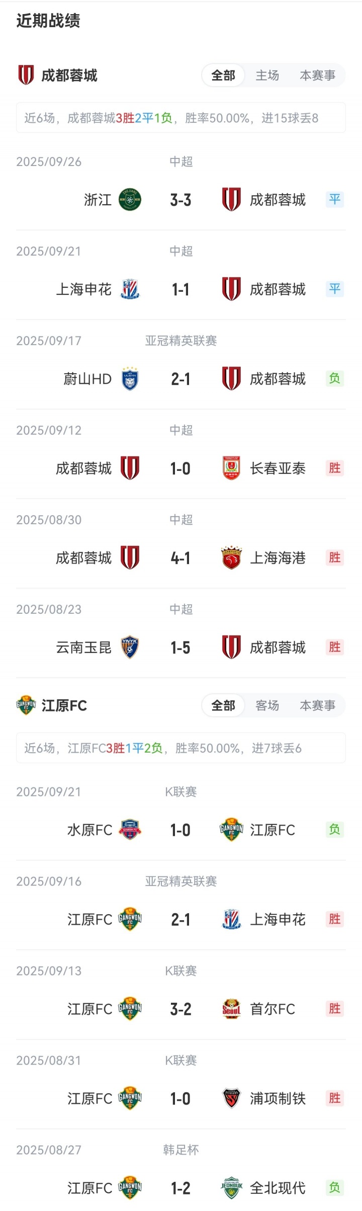 本场比赛是成齐蓉城首个亚冠正赛主场。蓉城首轮客场不敌蔚山HD,暂名次亚冠第8;江原FC主场2-1礼服上海申花,积3分名次亚冠第4。