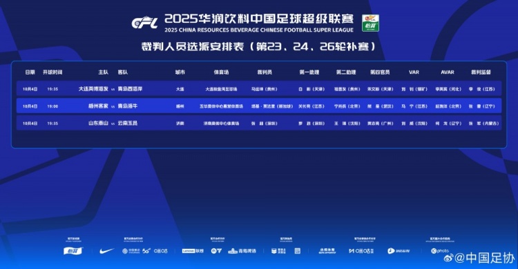 另外两场比赛,大连英博vs青岛西海岸的主裁是马运坤,而山东泰山vs云南玉昆的主裁则是张超,两场的VAR视频裁判诀别为刘钊和刘威。