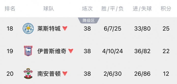 南安普顿上赛季38轮仅赢得2胜6平30负12个积分,早早锁定一个左迁限额。