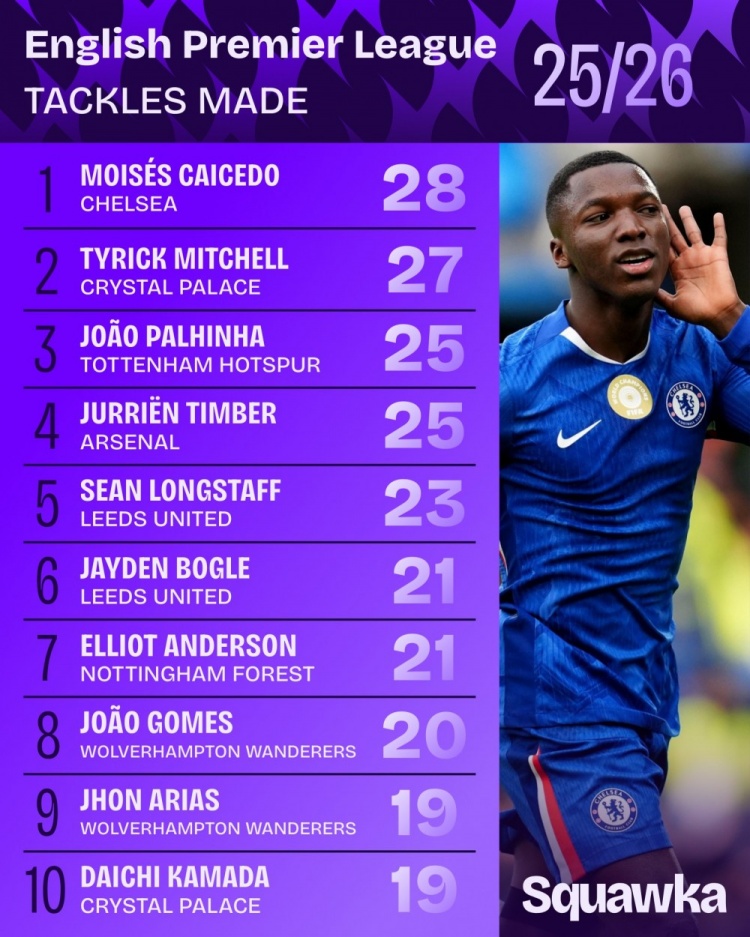 10月7日讯 Squawka统计了本赛季英超抢断榜前十,切尔西中场凯塞多28次位居第一,阿森纳后卫廷伯25次第四。