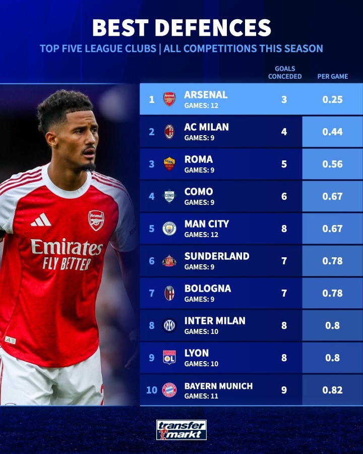 最强防地🧱阿森纳12场仅丢3球五大联赛最少,米兰9场丢4球第二