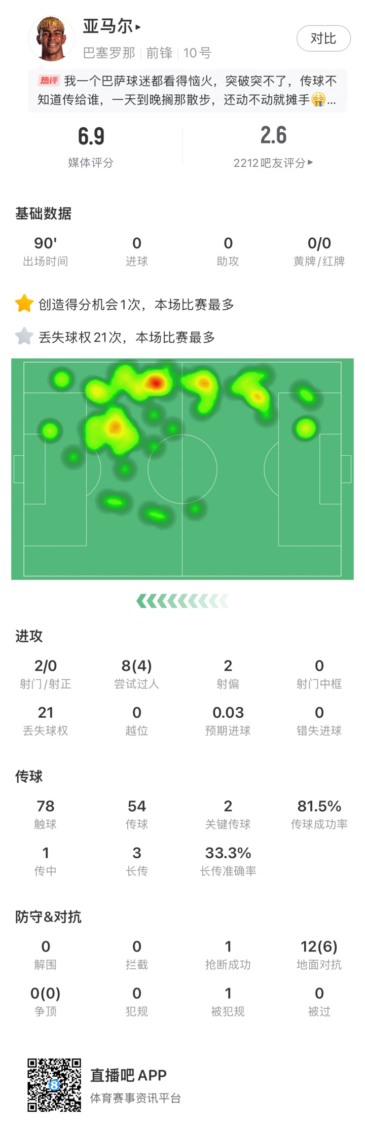 低迷!亚马尔国度德比发扬:2射0正,21次丢失球权,媒体评分6.9