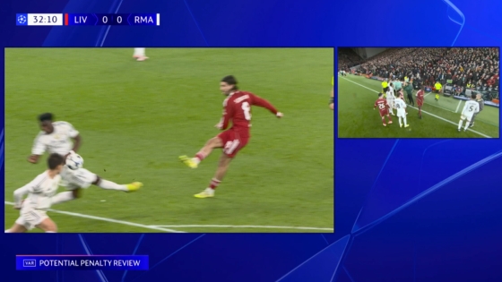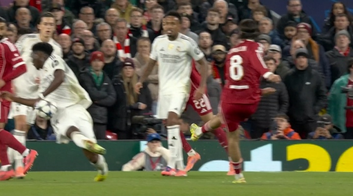 11月05日讯 利物浦vs皇马第31分钟,索博敲门击中琼阿梅尼手臂,裁判检查点球,VAR介入。