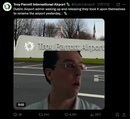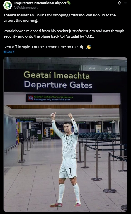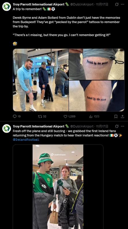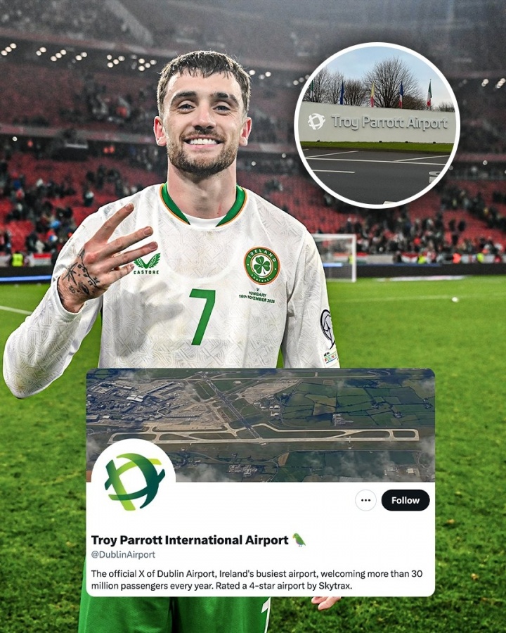 在爱尔兰临了3轮全胜,晋级附加赛的经过中,临了两场独进5球的前卫帕洛特无疑是最大元勋。对此,实行国度队来迎去送任务的爱尔兰齐柏林机场开玩笑地将官方社媒称号改为“特洛伊·帕洛特机场”,并连发多条动态庆祝: