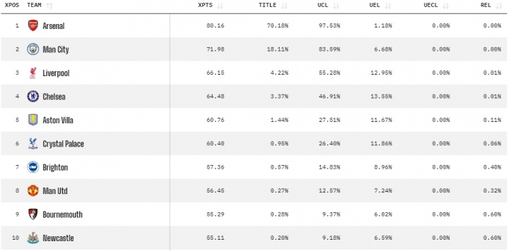 数据机构Opta的大数据瞻望再度进行更新,现在英超各队的夺冠概率:阿森纳夺冠概率升至70.18%,曼城18.11%;利物浦4.22%,切尔西3.47%。该榜单的第5名为1.44%的维拉,其余球队夺冠概率均不及1%。