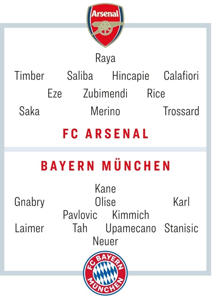 诺伊尔/莱默尔、若纳坦·塔、于帕梅卡诺、斯坦尼西奇/帕夫洛维奇、基米希/格纳布里、奥利塞、卡尔/凯恩