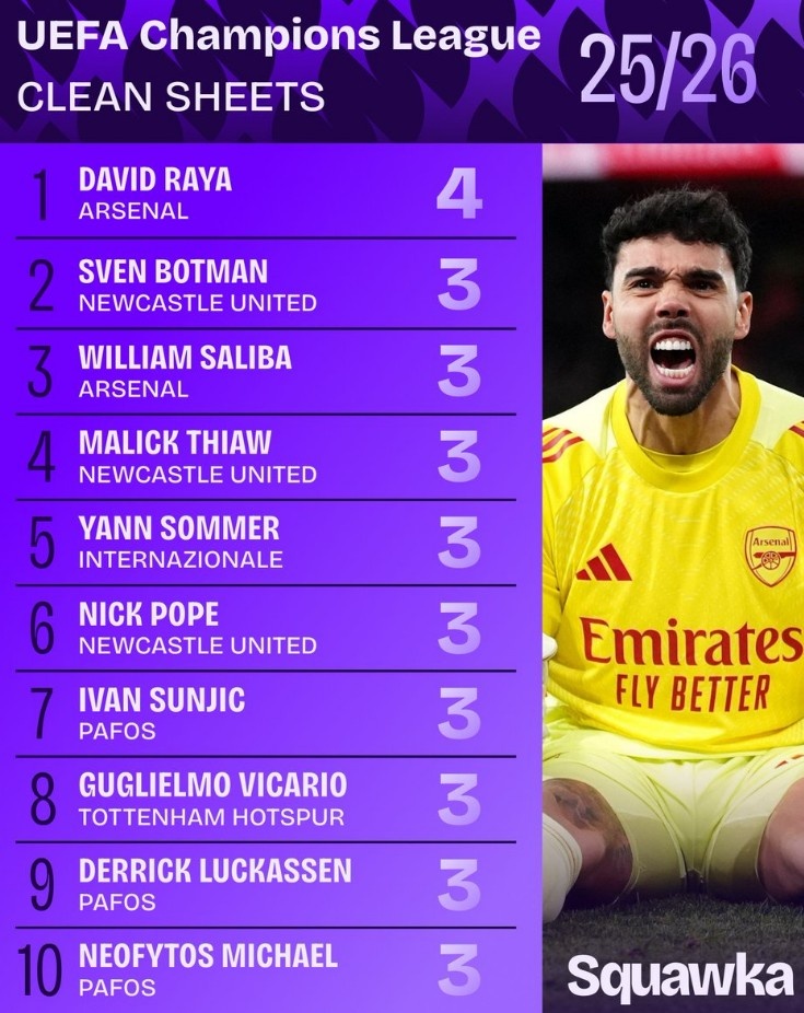 11月27日讯 本赛季欧冠5轮战罢,数据网站Squawka清点了本赛季当今零封场次榜,具体如下: