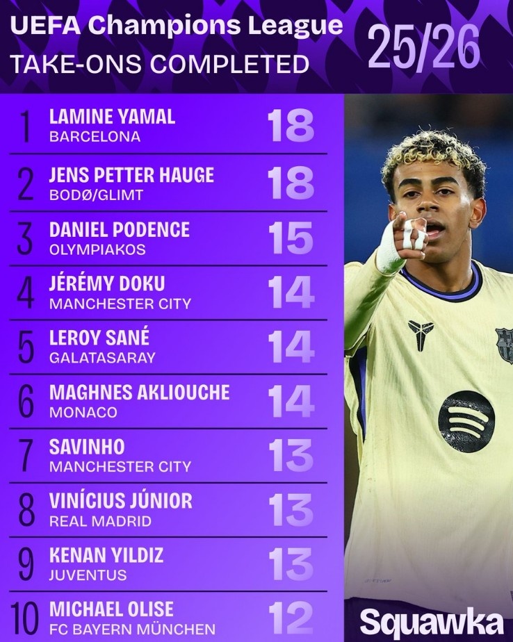 本赛季欧冠班师过东谈主次数榜:亚马尔18次居首,多库、萨内在列