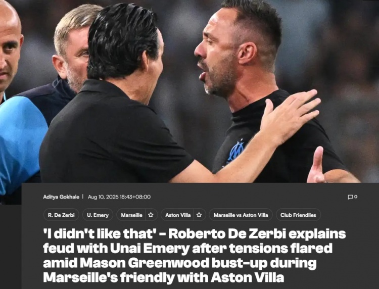 8月10日讯 马赛热身赛主场3-1击败维拉,马赛前锋格林伍德与维拉后卫明斯发生冲突,赛后双方主帅德泽尔比与埃梅里也在场边激烈交流。