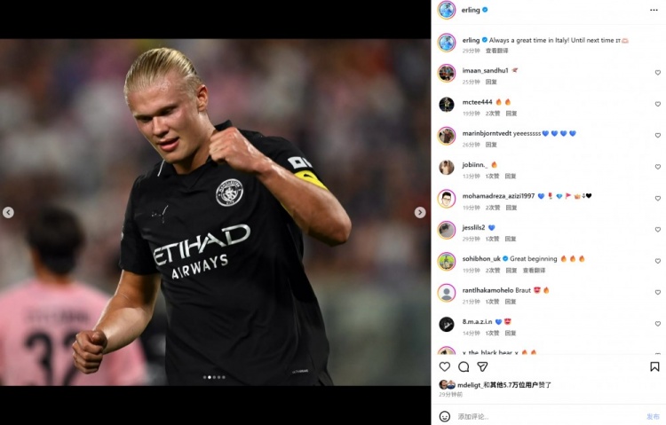 本场比赛哈兰德首发出战并有一球进账,哈兰德也在社媒晒出自己庆祝进球的照片,配文写道:“在意大利总能度过不错的时光,期待下次再来!”