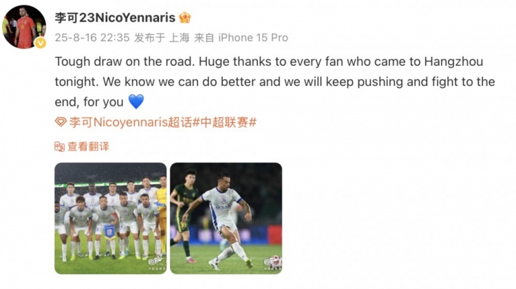 客场战平,结果艰难。衷心感谢今晚来到杭州的每一位球迷。我们知道我们可以做得更好,我们将继续拼搏,为你们战斗到最后一刻。