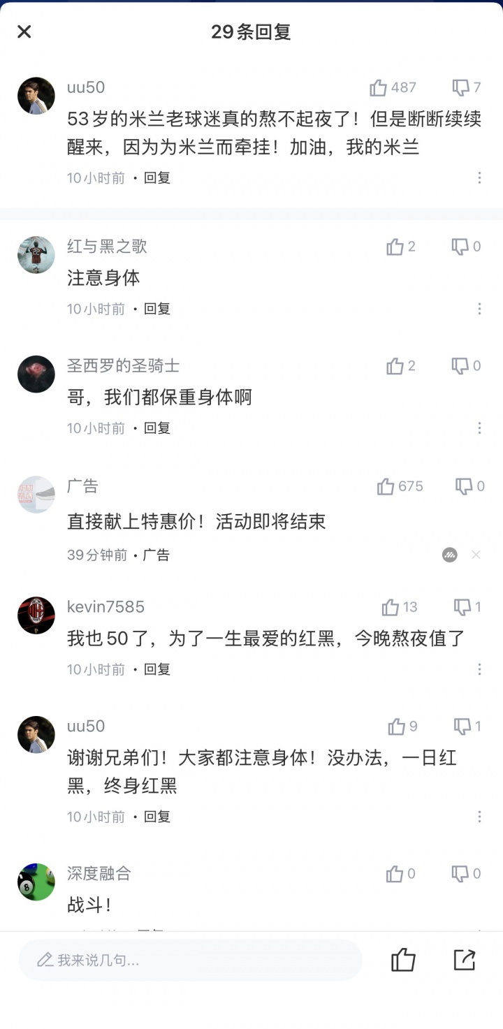 吧友【梦回圣西罗@】在AC米兰战报评论区评论:我得了尿毒症快四十的人了还在熬夜支持米兰,真希望米兰今年能绣上两颗星,我死都瞑目了。