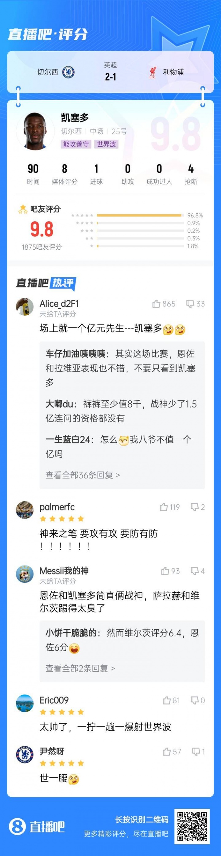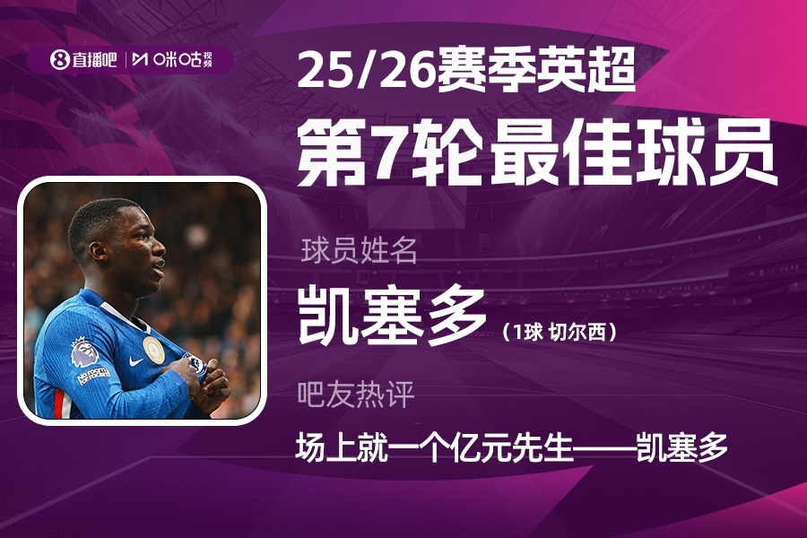 2025-2026赛季英超火热进行中,和咪咕体育联合发起每轮英超最佳球员评选活动!第7轮评选结果出炉,切尔西后腰凯塞多攻防兼备,轰入世界波帮助切尔西2-1战胜利物浦,获得吧友5.6万票的支持,当选 【X咪咕体育英超第7轮最佳球员】!