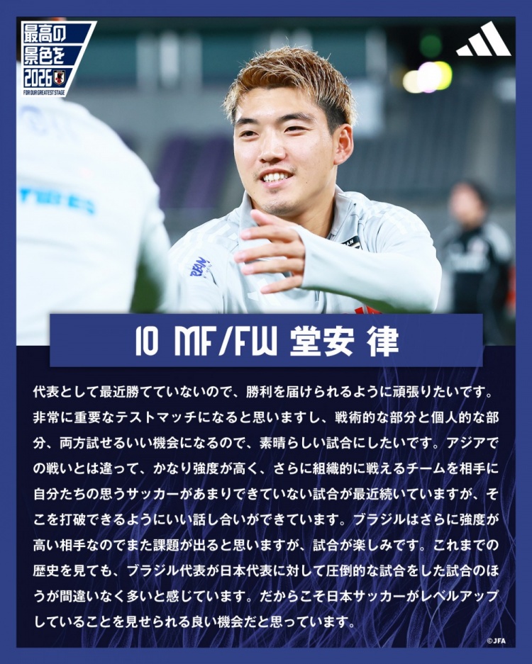 堂安律表示:“最近国家队未尝胜绩,因此我会努力帮助球队带来胜利。与巴西的比赛是非常重要的测试机会,无论从战术角度还是个人角度,都是检验自己的绝好机会,希望能在比赛中拿出表现。这场比赛与世预赛截然不同,比赛强度会非常高,对手的组织性很强,面对这样的对手比赛可能不会如我们料想的那样进展,虽然近期的比赛都是这样,但在肚内谈话室大家都表示要努力打破这样的局面。”
