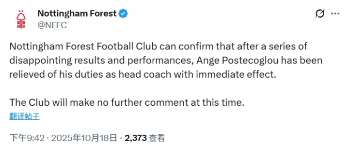 10月18日讯 英超第8轮,诺丁汉森林主场不敌切尔西。赛后诺丁汉森林官方宣布,刚刚上任39天的主帅波斯特科格鲁下课!
