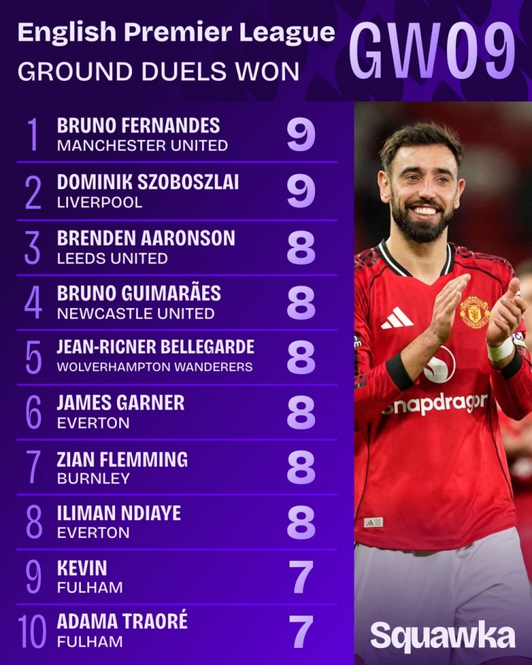 10月28日讯 英超联赛第9轮已经完赛,数据机构squawka统计了本轮地面对抗成功次数,曼联队长B费和利物浦中场索博斯洛伊并列居首。