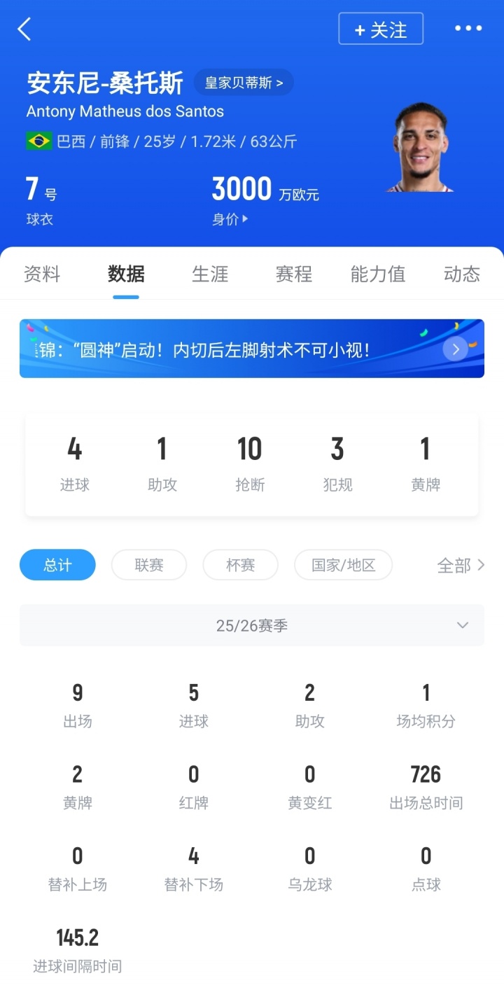 今夏以2200万欧永久转会贝蒂斯后,安东尼状态出色,各项赛事出战9场比赛,贡献5球2助,上一轮西甲安东尼2度轰出世界波,并有1次助攻,包办3球帮助球队3-0击败马洛卡。