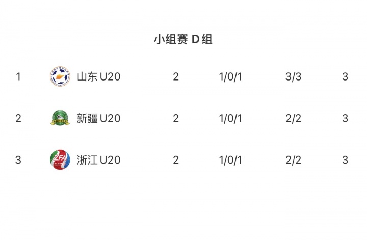 小组赛第2轮,浙江队2-1山东队,2轮过后,D组三队全部是1胜1负,山东队进球数多排名榜首,而浙江U20和新疆U20同分、同进球数、同净胜球且红黄牌一致,因此抽签决定谁出线。