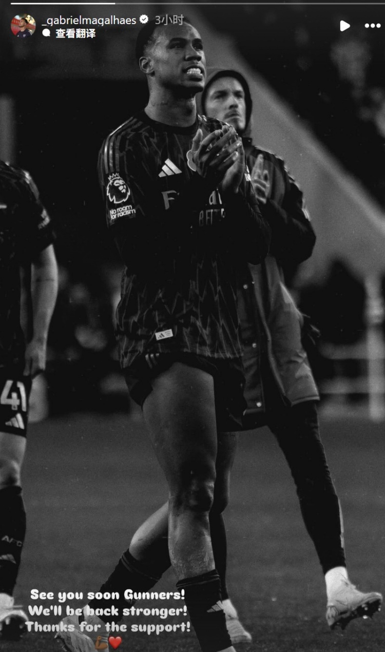 补时遭绝平,加布里埃尔社媒鼓励球队:我们会以更强姿态回归!