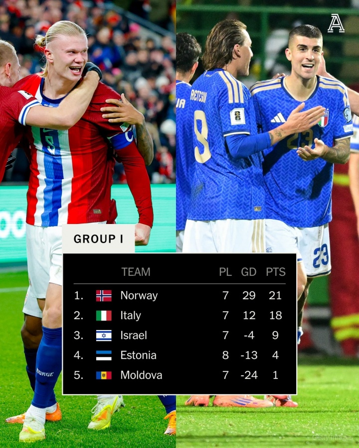 世欧预I组只剩最后一轮,榜二意大利主场对阵榜首挪威,挪威领先意大利3分+17个净胜球。意大利想要直通2026世界杯,末轮必须至少赢挪威9个球。