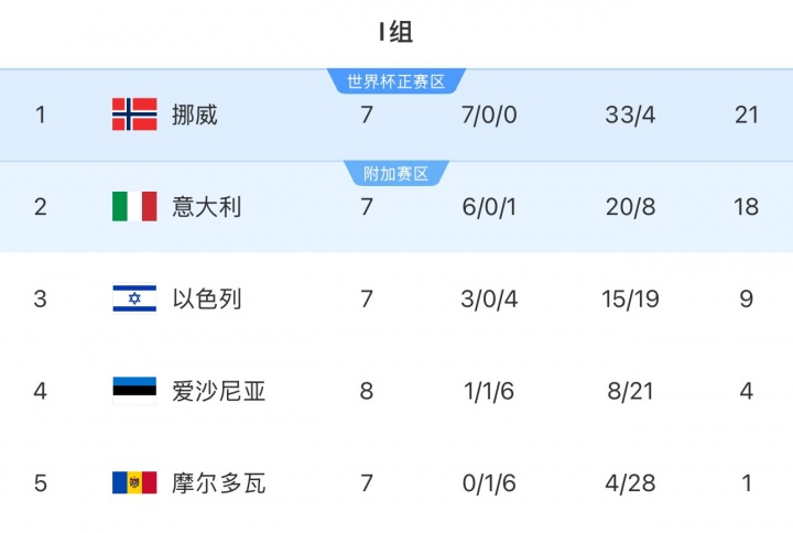 11月14日讯 世预赛欧洲区小组赛I组第9轮,挪威主场4-1大胜爱沙尼亚,基本锁定直通名额。意大利客场2-0击败摩尔多瓦,但出线希望渺茫。