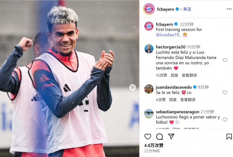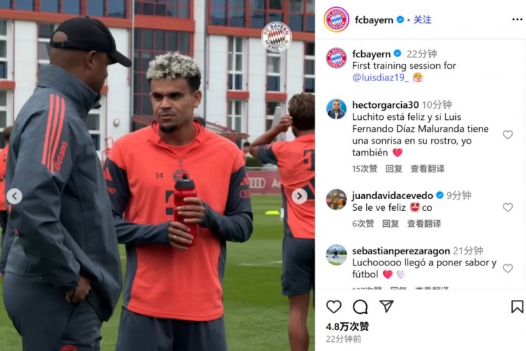 新仁报道!拜仁官方晒路易斯-迪亚斯首堂训练课:孔帕尼&凯恩同框