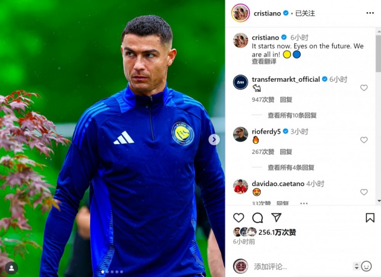 C罗回归利雅得胜利,参加球队的季前备战,他在社交媒体上晒出照片,配文:“现在开始,目光投向未来,我们全力以赴!”