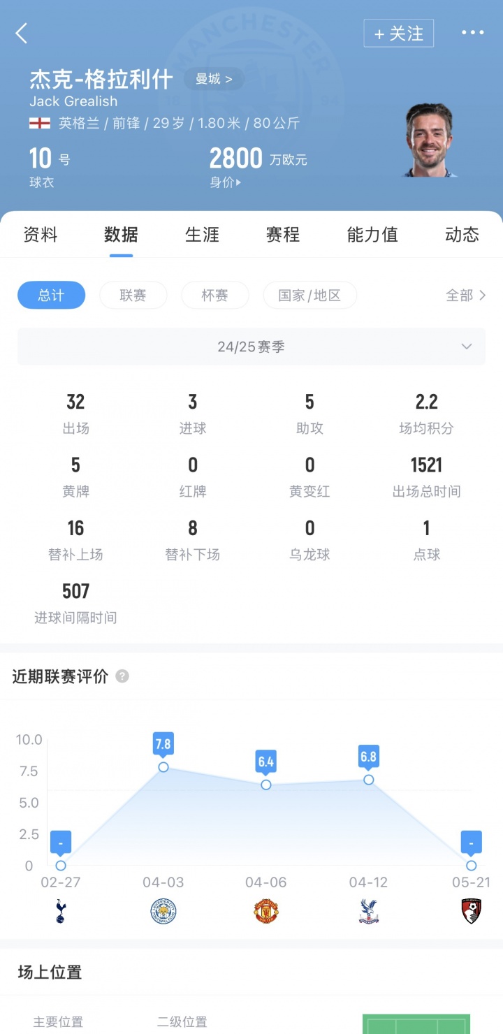 格拉利什2021年夏窗以1.18亿欧元转会费加盟曼城,搁置现在共为曼城出场157次打入17球23助攻。