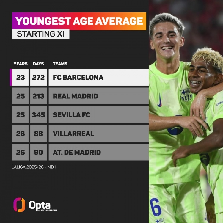 8月20日讯 Opta统计了西甲首轮比赛各队首发球员的平均年级,并排出最年青榜单,巴萨23岁272天居首,皇马25岁213天次席。
