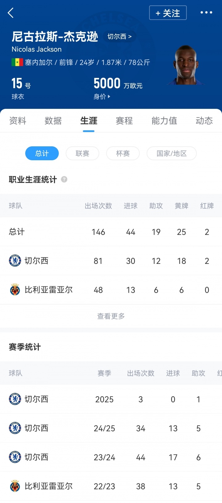 杰克逊现年24岁,加盟切尔西以来球员出场81次,孝顺30球12助。当今杰克逊德回身价为5000万欧元。